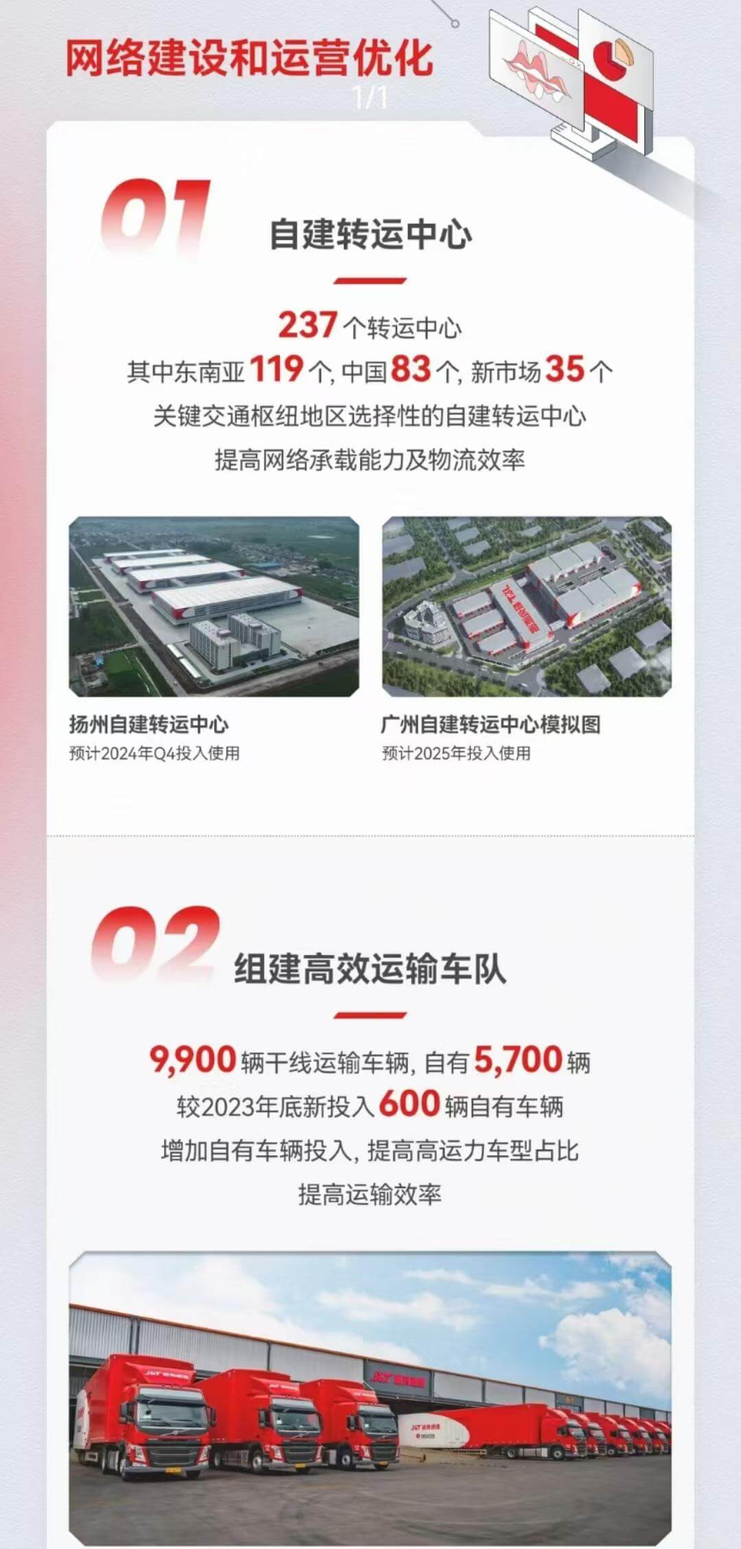 截至 2024 年 6 月 30 日,極兔速遞約有 8000 個網絡合作伙伴以及約 1.99 萬個網點,運作著 237 個轉運中心,配備 254 套自動化分揀線,經營著超過 4100 條干線線路和超 9900 輛干線車輛,當中包含超 5700 輛自有干線車輛。