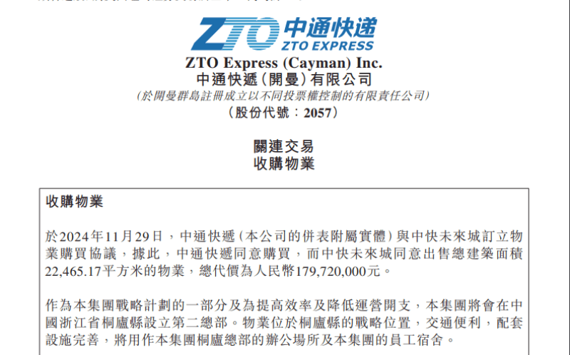 中通快遞近日與中快未來(lái)城訂立物業(yè)購(gòu)買協(xié)議,據(jù)此,中通快遞同意購(gòu)買,而中快未來(lái)城同意出售總建筑面積22,465.17平方米的物業(yè),總代價(jià)為人民幣179,720,000元。