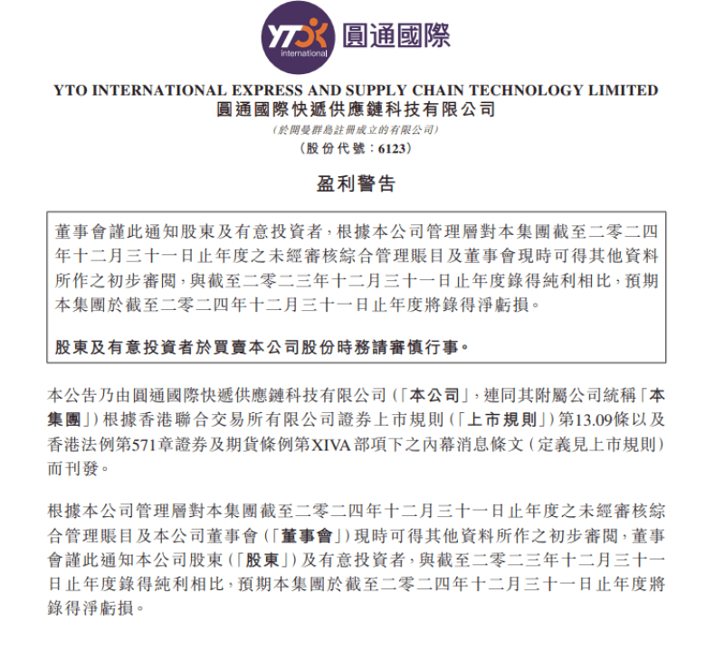圓通國際快遞近日發布盈利預警:與截至2023年12月31日止年度錄得純利相比,預期集團于截至2024年12月31日止年度將錄得凈虧損。
