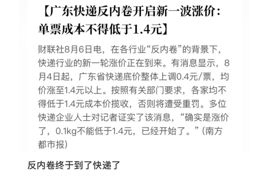具體來看,8月4日起,廣東省快遞底價整體上調0.4元/票,均價漲至1.4元以上,按照有關部門要求,各家均不得低于1.4元成本價攬收,否則將遭受重罰。