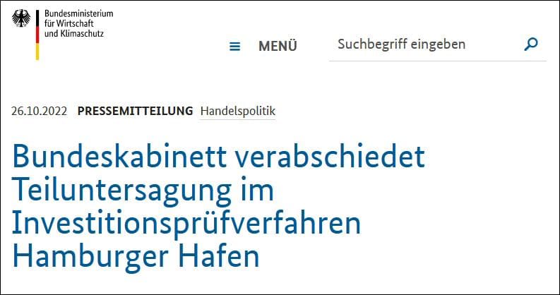 10月26日,德國(guó)聯(lián)邦經(jīng)濟(jì)和能源部發(fā)布聲明:德國(guó)內(nèi)閣會(huì)議部分批準(zhǔn)了中遠(yuǎn)海運(yùn)的投資,即該集團(tuán)只能獲得“福地”碼頭低于25%的股份,并禁止超過(guò)這一門(mén)檻的進(jìn)一步收購(gòu);即便在未來(lái),新的收購(gòu)也需要新的投資審查程序。