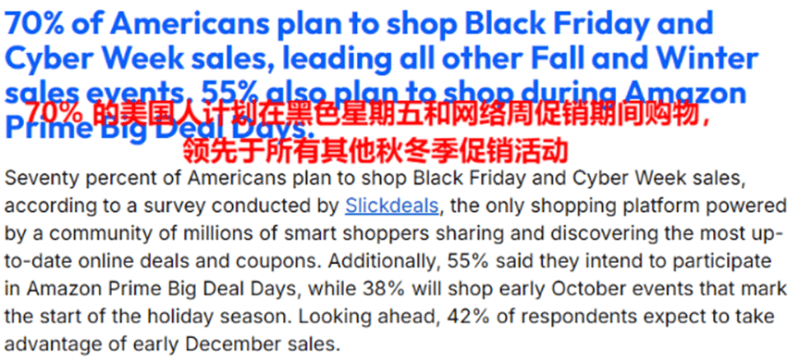 根據貝恩此前發布的研究報告,預計今年黑五網一大促活動期間,美國市場的零售額將同比增長5%,整體銷售金額有望突破750億美元大關。而美國在線交易和折扣信息分享平臺Slickdeals的一項調查則顯示,七成美國消費者已經計劃在今年黑五和網一促銷活動期間購物。
