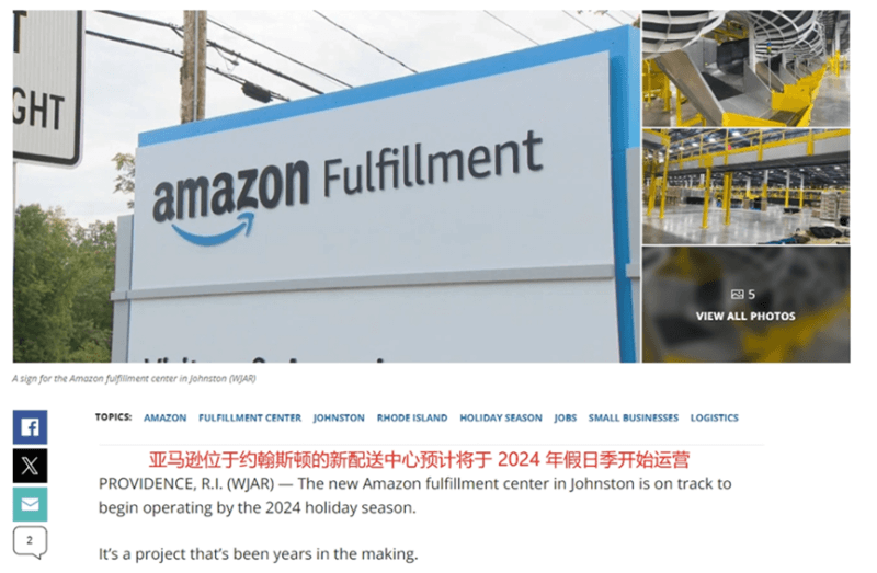 比方說電商霸主亞馬遜,今年假日季,它開放了多個新配送中心,比如位于約翰斯頓的新配送中心,以優化最后一英里配送。這些物流設施配備了高度自動化的倉儲設備,能夠快速響應需求,提高亞馬遜的分揀和配送效率。
