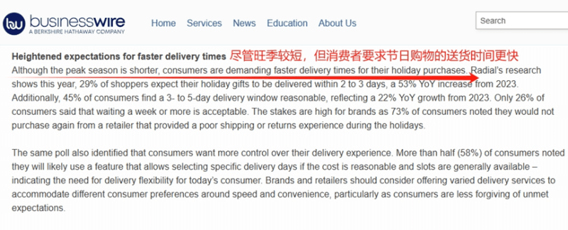 今年10月,Radial對1000名美國成年消費者的調查顯示,將近3成(29%)的消費者希望能在2到3天內收到商品,這一比例相較于去年同期有明顯增加;只有26%的消費者能夠接受一周以上的送貨時間;同時,高達73%的消費者表示,如果零售商不能在旺季期間提供令他們滿意的送貨服務,那么他們就不會在該零售商那里購買商品。