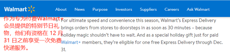 另外值得一提的是,沃爾瑪的付費Walmart+會員有更多送貨福利。如果在當地時間12月24日下午4點前下單,那么他們可以獲得一次免費快遞服務的機會,時間是截止到12月31日。