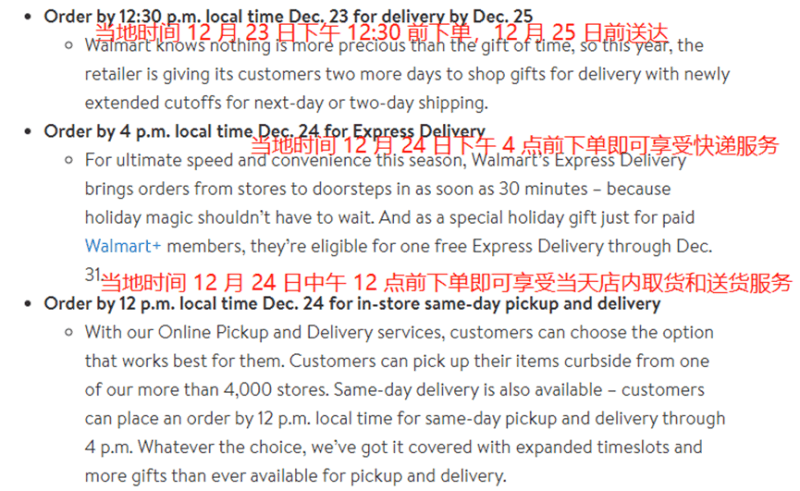 近日,零售業巨頭沃爾瑪發布公告,宣布將延長假日季的送貨截止日期。具體來看,如果消費者在當地時間12月23日12:30前下單,那么就能享受到兩日達送貨服務,即在12月25日前就可以收到商品;如果消費者在12月24日下午4點前下單,那么可以享受到沃爾瑪的快遞服務,最快30分鐘內能收到商品;如果在12月24日中午12點前下單,那么可以享受當天店內取貨和送貨服務。