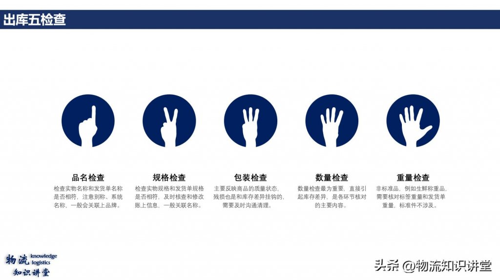 五檢查。這個跟核對其實是一個意思,對照單子的發貨明細核對商品的五個內容,品名、規格、包裝、數量、重量。