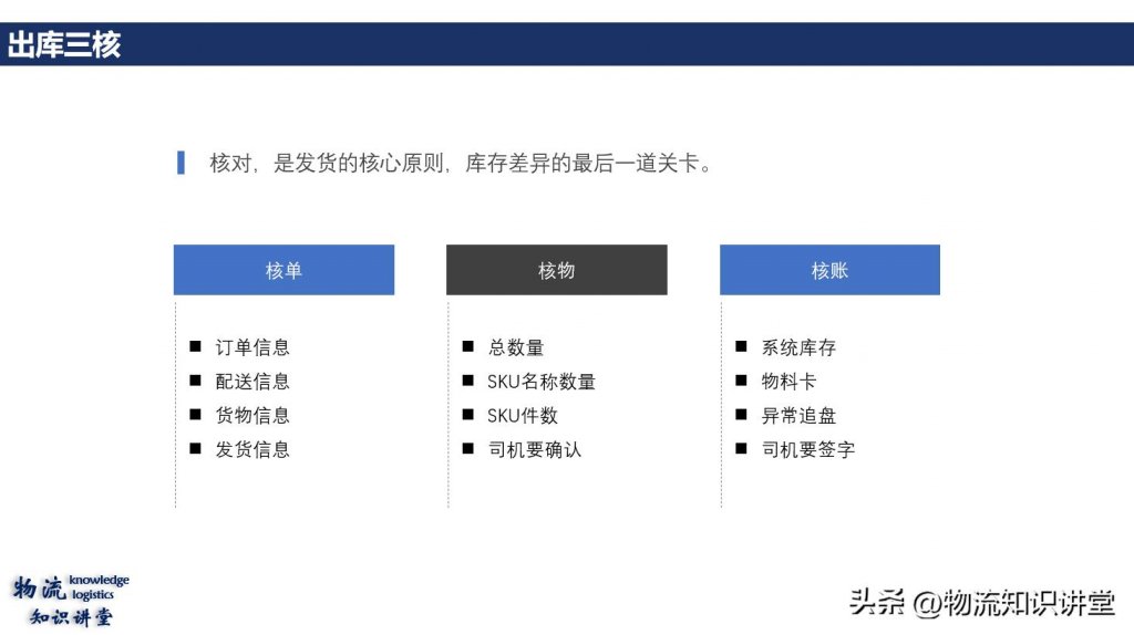 核賬,這個賬指的是系統賬。一般情況下,出庫核對沒有問題的話,不需要核賬,核對有問題,那是必須要查賬的。發貨員和司機確認一個SKU少了一件,這時應該第一時間去查系統,看是哪個貨位揀貨的,這個SKU的數量是多少。如果庫里沒少,要么就是串貨要么就是之前的歷史差異,串貨肯定是要去查其他線路的數量的,要查監控的。異常查清楚后,才能夠發貨。