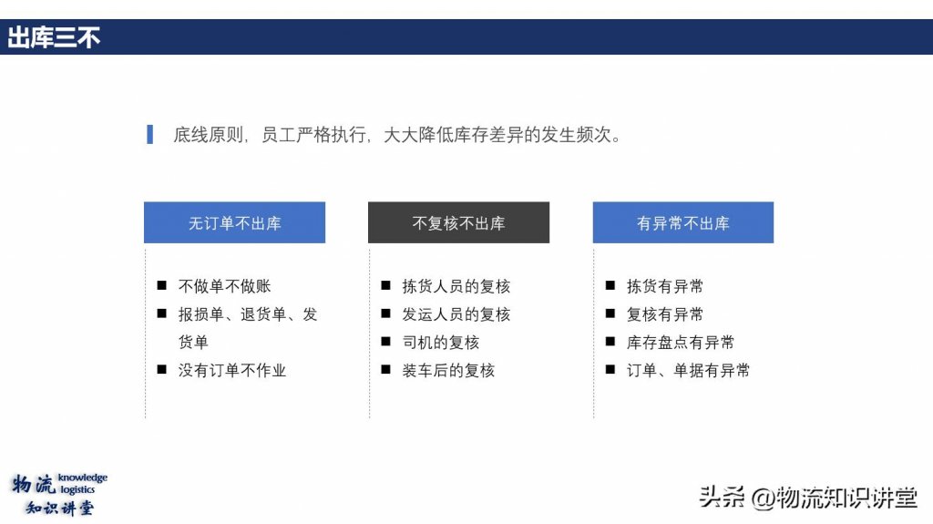 有異常不出庫。主要是針對裝車核對后出現的異常,及時核查避免有差異產生。很多時候員工的操作,可能就稀里糊涂就過去了,這需要管理層強調操作,強調標準,明明庫里某個SKU發現有差異了,這個時候肯定要重點復核一遍才能出庫的。