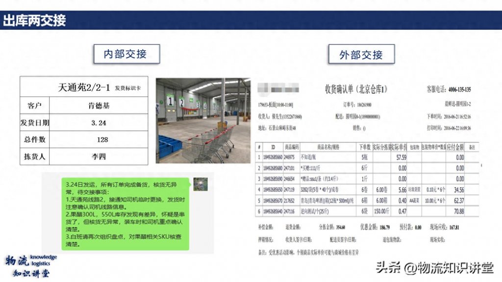 要發的貨一目了然,指定地點,到現場固定的區域去找標識,就知道是哪個區域哪條線路哪張單子的貨。其次,每托盤的貨,應該粘貼標識,注明發貨日期,數量,揀貨人等信息,天通苑2是區域線路,2-1是兩托盤貨,這是第一托的意思。