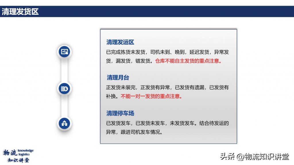 都過了正常發車的時間點了,結果現場發貨區還有一堆貨,那肯定有問題。清理發貨區,主要是倉庫的待發運區,就是備好了貨,只等司機來拉了,待發運區的狀態結合月臺裝車的進度,結合停車場司機發車的進度,有異常一下就能看出來。