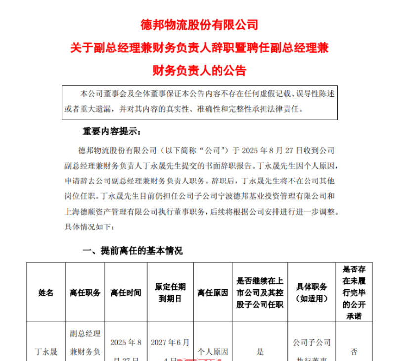 德邦股份近日發布重大人事變動公告:原副總經理兼財務負責人丁永晟因個人原因辭職,由京東背景高管楊川接任該職務。公開資料顯示,丁永晟為京東系高管,1981年出生,畢業于對外經濟貿易大學,國際貿易學碩士,中國注冊會計師及美國注冊會計師。