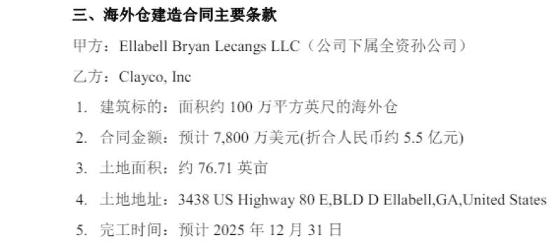 公告顯示,為進一步提升公司競爭力,加速公司公共海外倉業務發展,公司下屬全資孫公司EllabellBryanLecangsLLC擬與Clayco,Inc.簽訂“美國佐治亞州Ellabell海外倉項目”建造合同,建造總價預計7800萬美元(折合人民幣約5.5億元)。